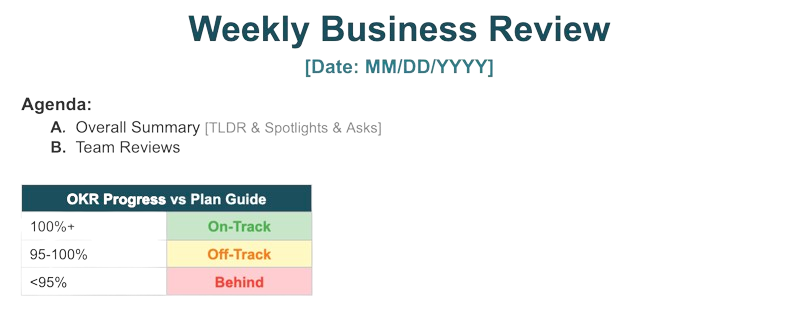 - He said it is also important that teams feel they can ask for help in the WBR. It should not feel like a pure judge-and-jury setting. It should also be a place where teams can surface blockers, get input, and get help moving a goal forward