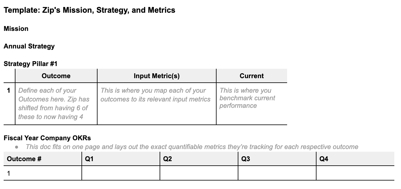 - Rujul previously relied on a one-page framework that mapped all outcomes and quarterly metrics on a single document. Over time, this became stale, so Zip shifted to a tracker for company-wide initiatives. The process for how Zip uses this tracker is outlined below:
